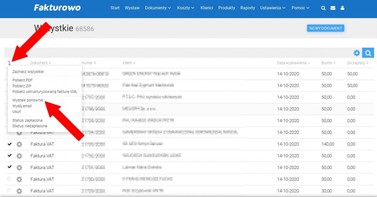 Aby wystawić nowy dokument na podstawie wielu dokumentów już istniejących (np. fakturę VAT na podstawie kilku dokumentów WZ lub miesięczny / dobowy raport fiskalny na podstawie paragonów) należy przejść do zakładki - Dokumenty > Wszystkie - lub innej zakładki np. - Dokumenty > WZ.