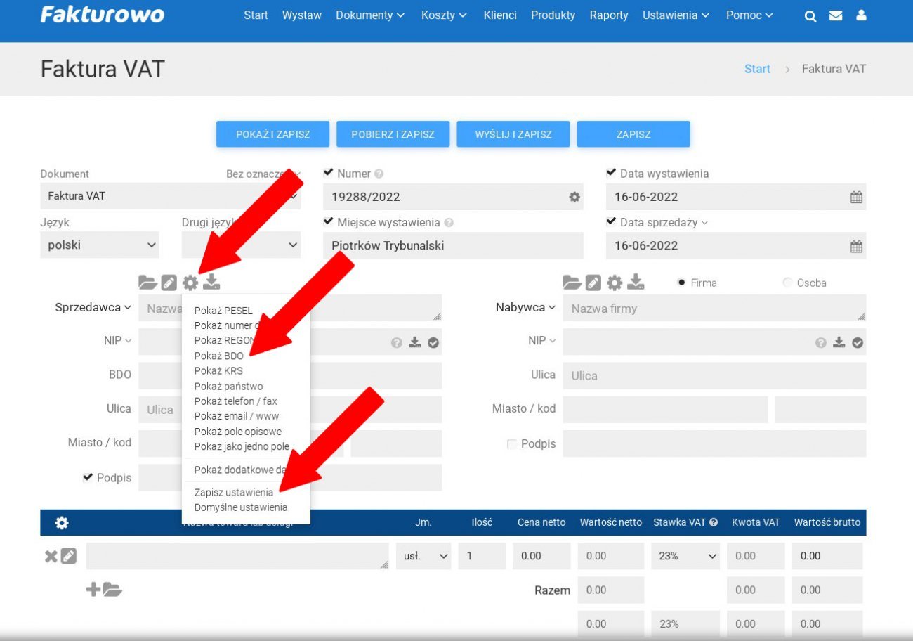 Najpierw należy włączyć numer BDO - w tym celu klikamy ikonę znajdującą się przy danych sprzedawcy, następnie klikamy - Pokaż BDO - następnie klikamy - Zapisz ustawienia - po zapisaniu pole opisowe będzie zawsze widoczne - jeśli nie zapiszemy ustawień to przy następnym wystawieniu dokumentu pole należy włączyć ponownie.
