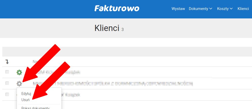 Aby usunąć/edytować dane zapisanego klienta (w tym również dane domyślnego sprzedawcy) należy przejść do zakładki - Klienci - następnie należy kliknąć ikonę zębatki znajdującą się na liście z lewej strony przy kliencie, którego chcemy usunąć/edytować, następnie z rozwijanej listy, która się pojawi należy wybrać odpowiednią opcję (przedstawia to pierwszy zrzut ekranu).