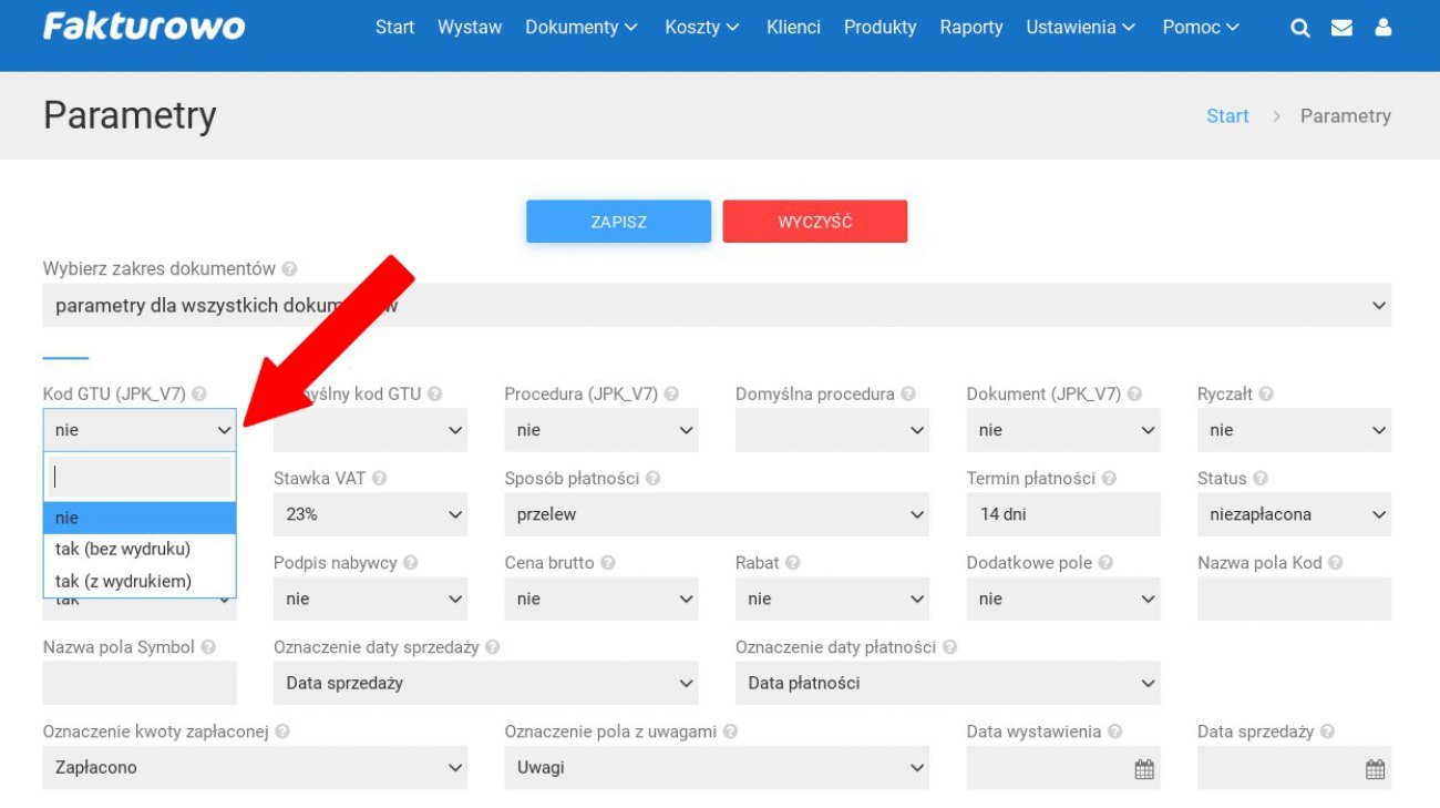 Możliwość oznaczania kodów GTU jest domyślnie wyłączona. Aby włączyć możliwość oznaczania kodów GTU dla towarów i usług, należy na stronie - http://www.fakturowo.pl/ustawienia - w polu - Kod GTU (JPK_V7) - wybrać jedną z opcji - TAK - następnie kliknąć przycisk - Zapisz (zrzut ekranu na dole strony).- Po wybraniu opcji - tak (bez wydruku) - oznaczenie kodu GTU nie będzie widoczne na wydrukowanym dokumencie, będzie widoczne tylko na podglądzie dokumentu oraz w plikach JPK_V7.