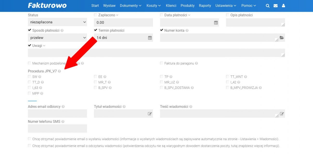 Możliwość oznaczania procedur w programie jest domyślnie wyłączona. Aby włączyć możliwość oznaczania procedur identyfikujących rodzaj danej transakcji dla towarów i usług, należy na stronie - https://www.fakturowo.pl/ustawienia - wybrać w polu - Procedura (JPK_V7) - jedną z opcji - TAK - następnie kliknąć przycisk - Zapisz (zrzut ekranu na dole strony). Oznaczanie danej procedury dotyczy całego dokumentu, a nie poszczególnych pozycji na dokumencie.
